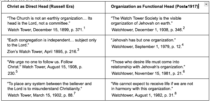 Statements and teachings emphasizing trust in and obedience to the organization (the “faithful and discreet slave” / Governing Body) place organizational authority ahead of individual judgment or interpretation of Scripture.